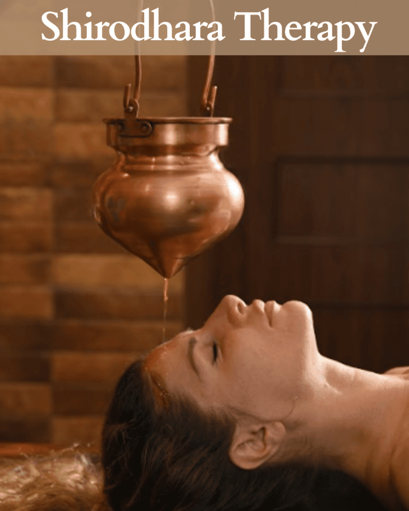 Shirodhara is an Ayurvedic therapy where warm, herbal oil is gently poured over the forehead, specifically targeting the “third eye” area. This therapeutic treatment calms the nervous system, reduces stress, and promotes mental clarity. The steady flow of oil helps release mental tension, offering a peaceful and balanced state of mind.